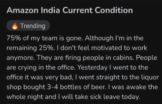 A recent viral Reddit post has cast a stark light on the emotional turmoil sweeping Amazon India’s offices, as the company undertakes massive layoffs. The anonymous employee, whose original post is widely shared (see attached image), reports that an astonishing 75% of their team has been let go, leaving those who remain just 25% of the original group, grappling with deep demotivation and anxiety amidst ongoing firings.